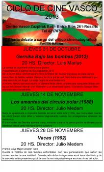 Se inicia la 4º edición del Cine en el Zazpi El próximo jueves 16 de abril a las 20.00 hs. Comenzamos las proyecciones del año 2015. Con una película española. "Ocho apellidos vascos" Es una película dirigida por Emilio Martínez Lázaro. Rafa es un joven sevillano de una familia adinerada que conoce a una hermosa chica vasca durante las fiestas de la feria de Sevilla de la cual se enamora. Para conseguirla tendrá que hacerse pasar por vasco, una de las peores pesadillas para él. La película está subtitulada. Después de la misma el profesor Emilio Bellon coordinara la charla debate. Al culminar los que deseen podrán continuar la velada saboreando los tradicionales Pintxos. Invitamos a todos a disfrutar de este encuentro.